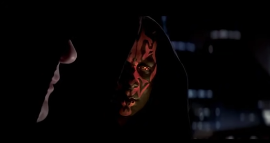 I'd also like to point out the delightful use of screen wipes, though I couldn't get a good capture of it. I wish more films used this feature; you can create all sorts of interesting juxtapositions with it. In this transition the sandstorm on Tatooine sweeps in from the left, erasing Sidious and Maul like a furious gust of wind.