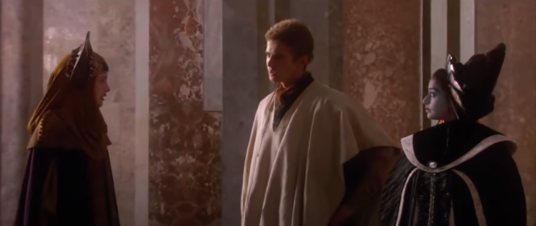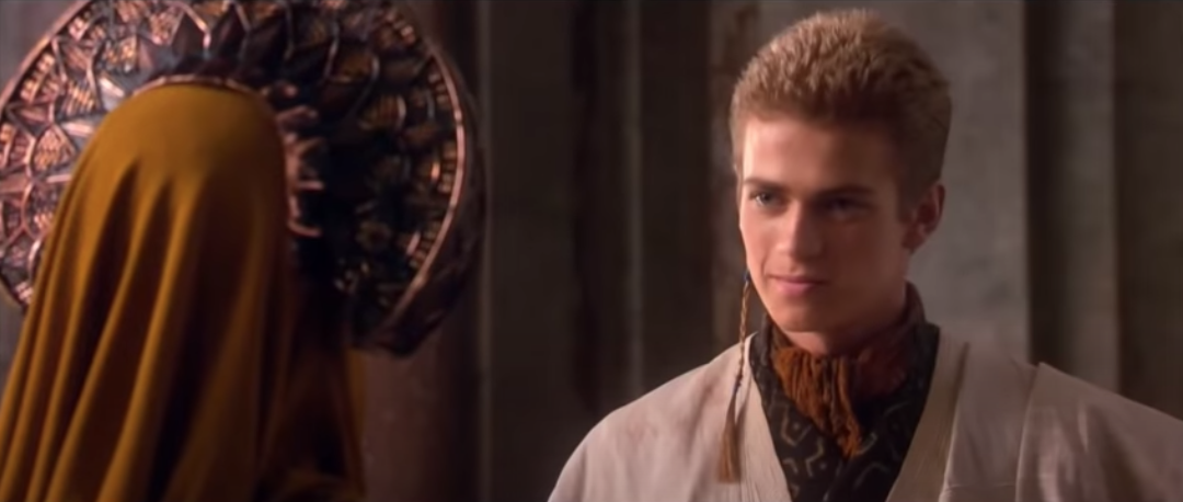 Or not! He takes a breath, apologizes, and moves on. A significant departure from his sullen responses to Obi-Wan. Is he learning to curb his pride, or is he just more willing to defer to Padmé by reason of "I have a massive crush on her"? Either way, this is a marked improvement. The next time Padmé takes charge, his response will be far more easygoing.