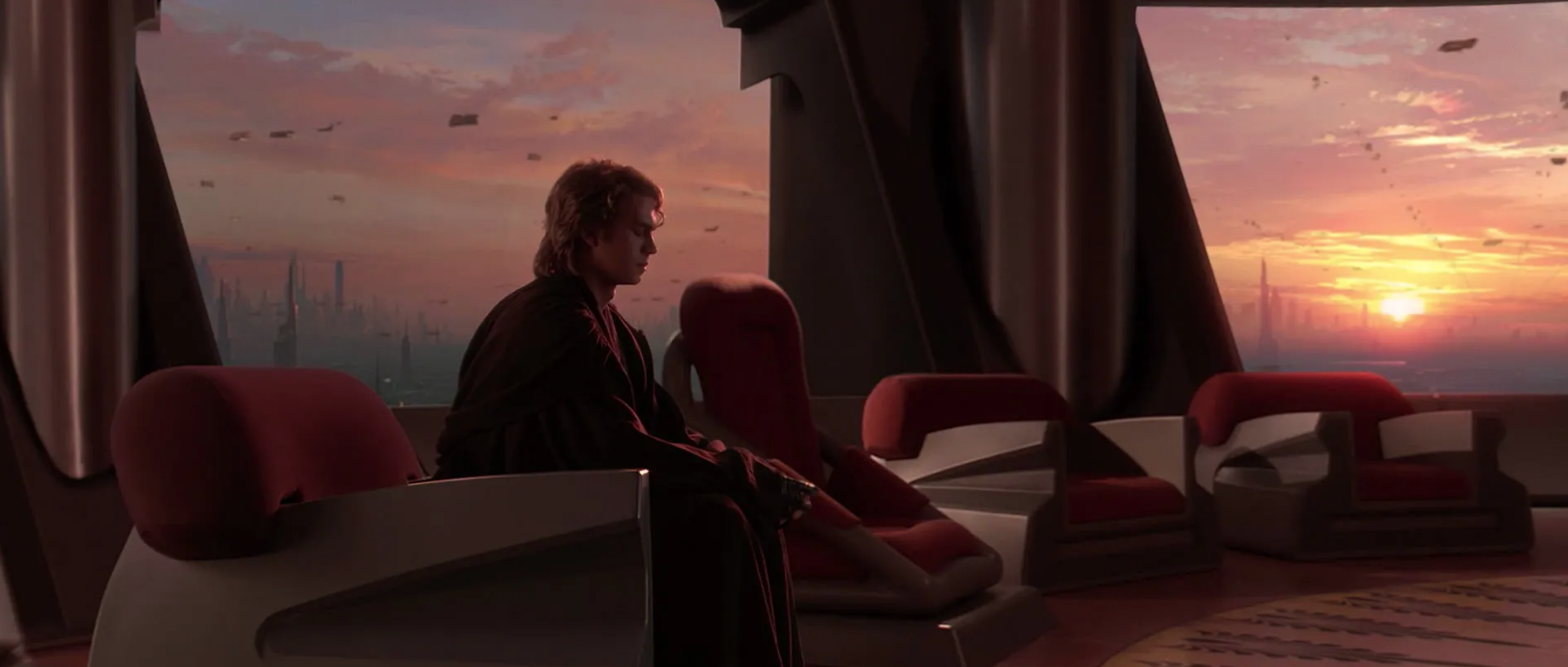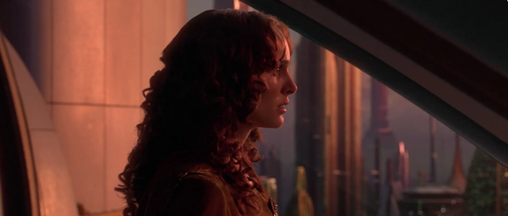 I appreciate that Lucas tweaked this sequence when it became clear that Anakin's motivations for turning weren't coming across as clear as he wanted. The silent exchange between the Council chamber and Padmé's apartment is exactly what we needed. And what a showcase of his artful use of cinematic language. Padmé and Anakin's shots are set up in mirrored parallels. A wide shot of her room and a close up of her face, followed by a wide shot of the chamber and a close up of his. Framed as if they're looking at each other even across the vast city. We need no dialogue, no complex explanations. While the eerie, mournful music heightens, we see these two fall into sync like two halves of a beating heart.